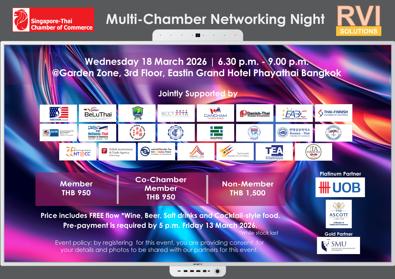 Dear Members & Friends, DTCC is pleased to invite you to the co-branded event Multi-Chamber Networking Night hosted by the Singapore-Thai Chamber of Commerce on Wednesday, 29 April, at Capella Hotel, Bangkok. Event Details: Date: Wednesday 29 April 2026 Time: 6:30 p.m. - 9.00 p.m. Venue: Ballroom, Capella Hotel Bangkok Member: 500 THB